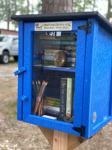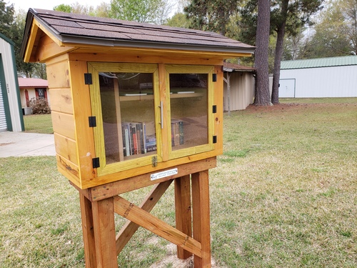 There was a beautiful but lonely tree, located among beautiful Louisiana Pine Trees on a long, winding road. Our vision was, that if we added a LFL , the community would gather and the tree would no longer be lonely. We have books for "smalls" and "talls" and treats for our 4 legged book chewers. We own a Blind/Shutter business, so it is built with scraps with a "shutter" theme. We even have a night light in case a Vampire drops by!